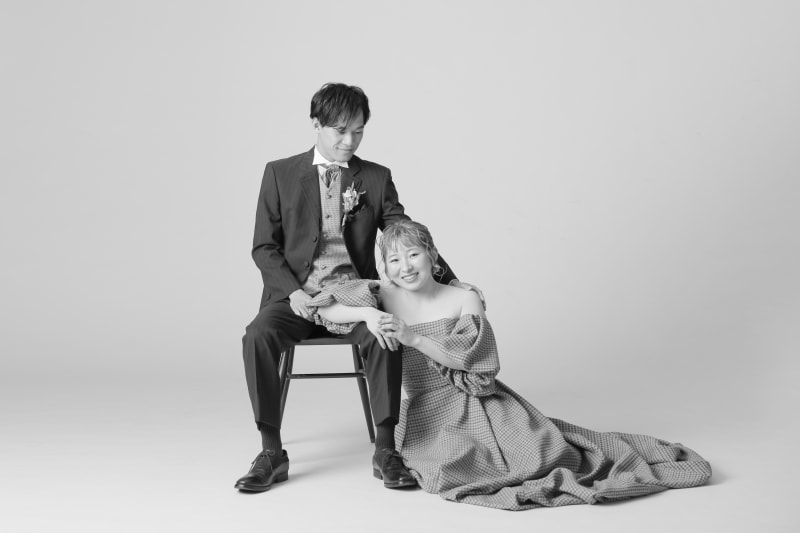 モノクロでクールに。 全面真っ白のスタジオは、昔の写真館のような印象を持つ方も多いと思いますが、非現実的でおしゃれにも撮影できます!