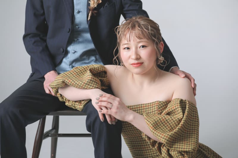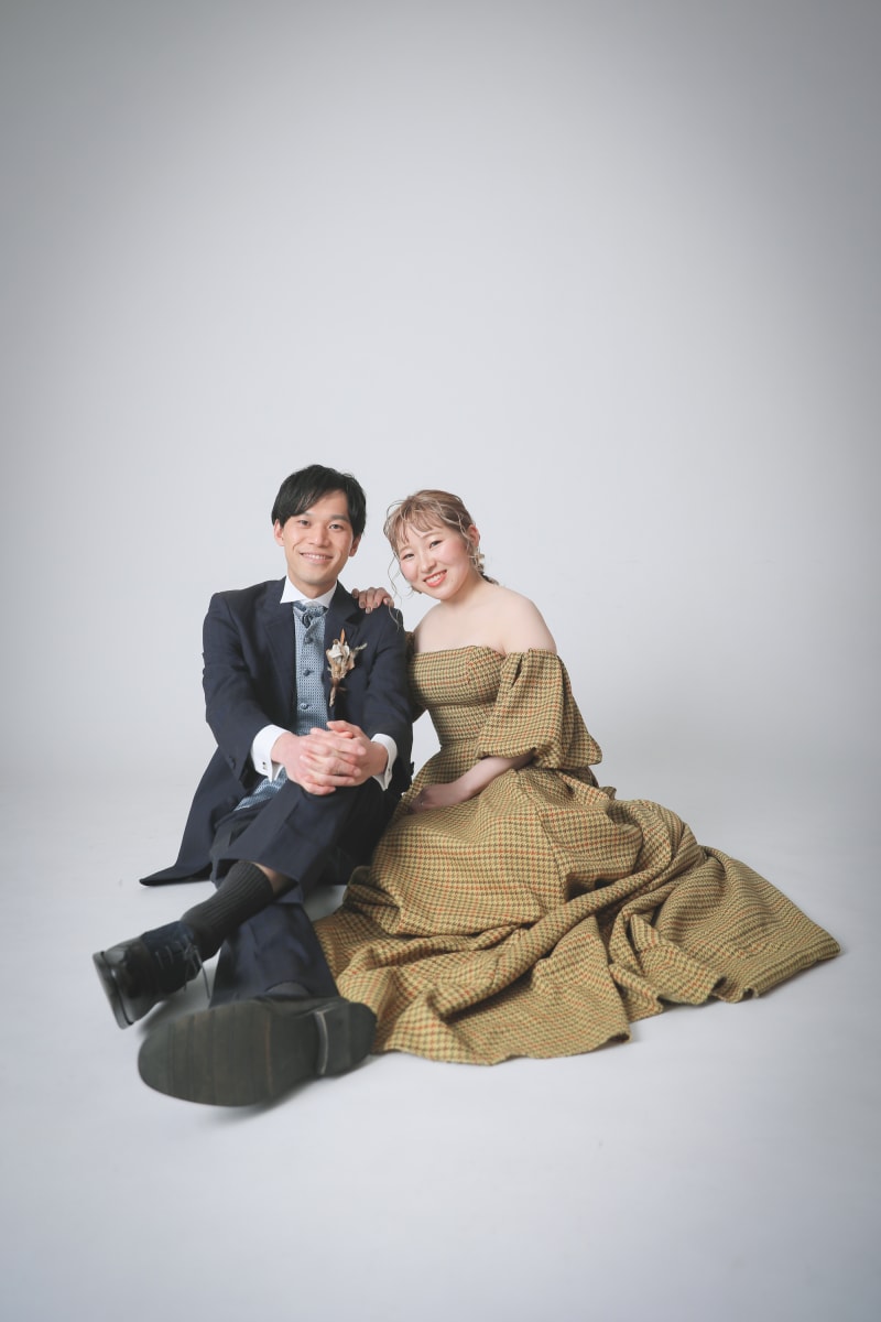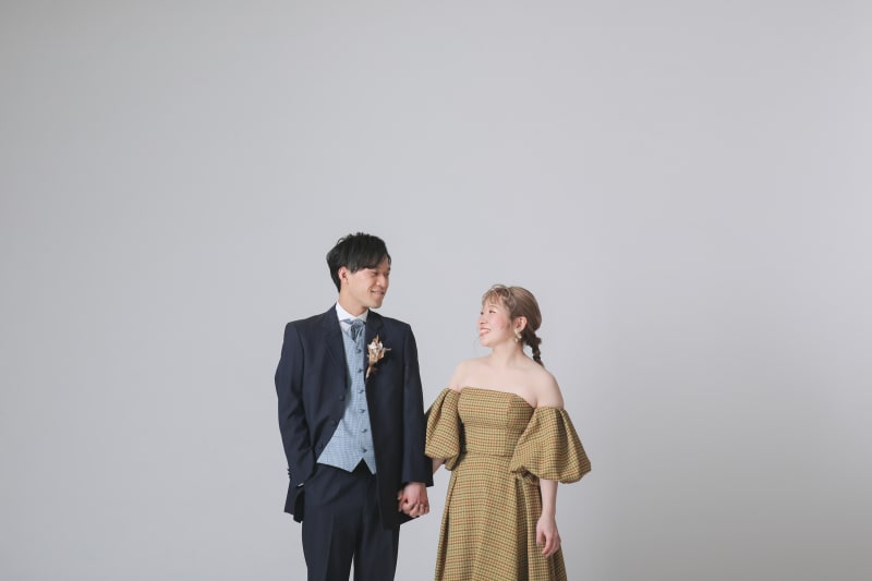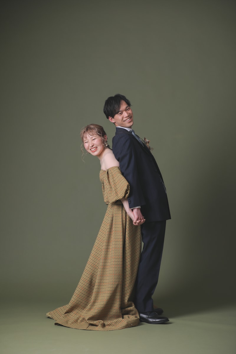 新しいカーキの背景は、白い背景とは違う印象になります!お二人のコーディネートにもぴったりでした!
