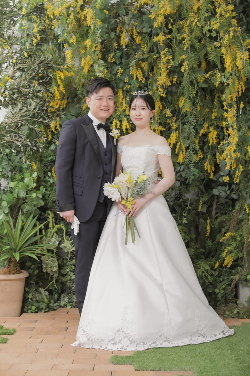 室内とは思えないグリーンのボリューム。黄色いミモザのお花がかわいい背景です!!
