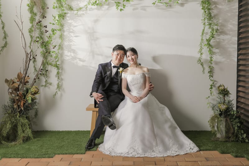 ライトで木漏れ日を演出。ベンチに腰掛け、ナチュラルに。お二人の自然な笑顔がかわいい!