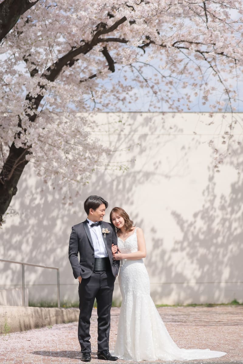 校舎の近くに大きな桜の木がありました。満開の桜とピンクの絨毯で春を感じる素敵なショットです。