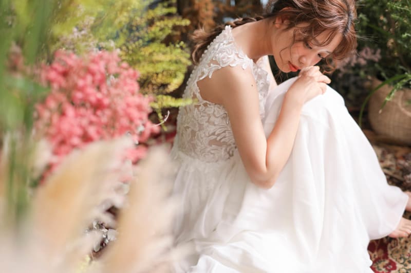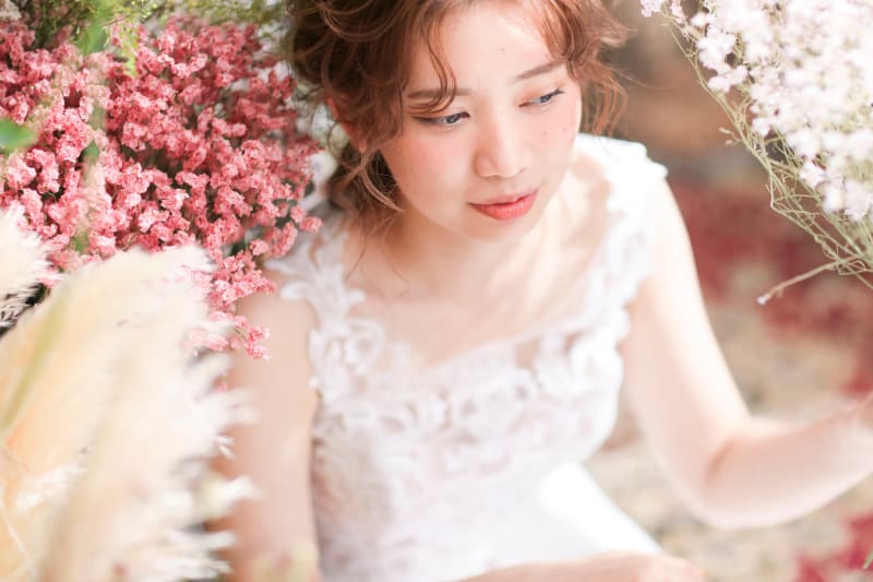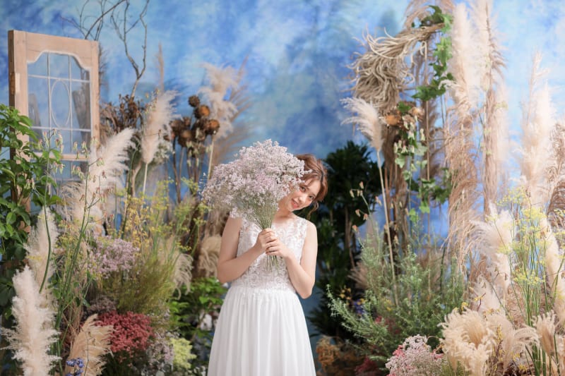 可愛らしいお花に囲まれたお写真も!天気がいい日のお花畑で撮影したような1枚に!
