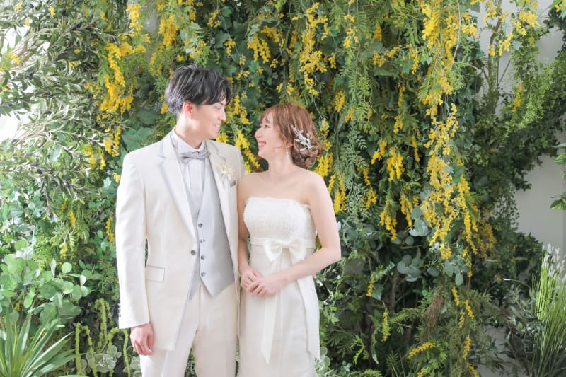 まずはミモザを背景に撮影をしました。黄色と緑の空間で可愛く撮影できます。