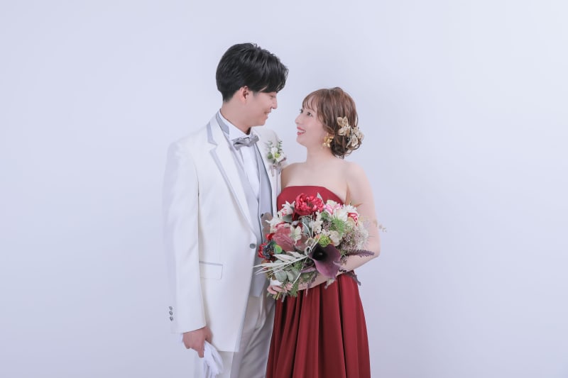 2着目のお衣装に着替えての撮影。まずはシンプルな白の背景で撮影しました。