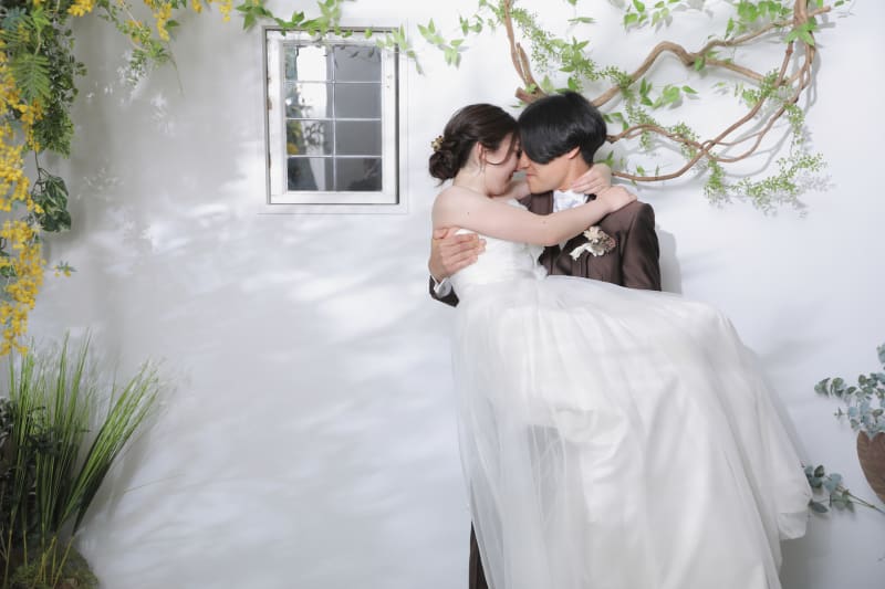 ご新郎様にご新婦様をお姫様抱っこしてもらいました。いつものお二人と違う雰囲気で撮影できるのもハウススタジオの魅力のひとつです。