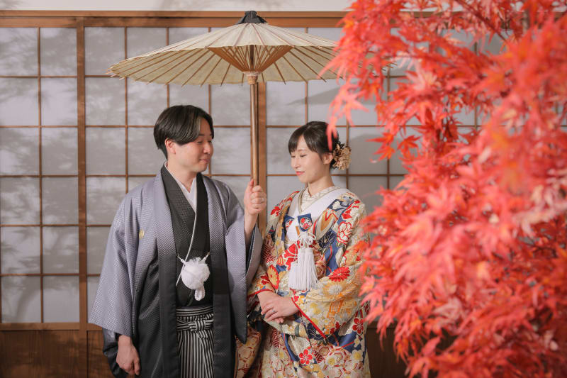 小物を使うことによって同じ場所でもたくさんのバリエーションを撮影することができます! また、季節に関係なく桜や紅葉の写真を撮れるのもスタジオの魅力!!