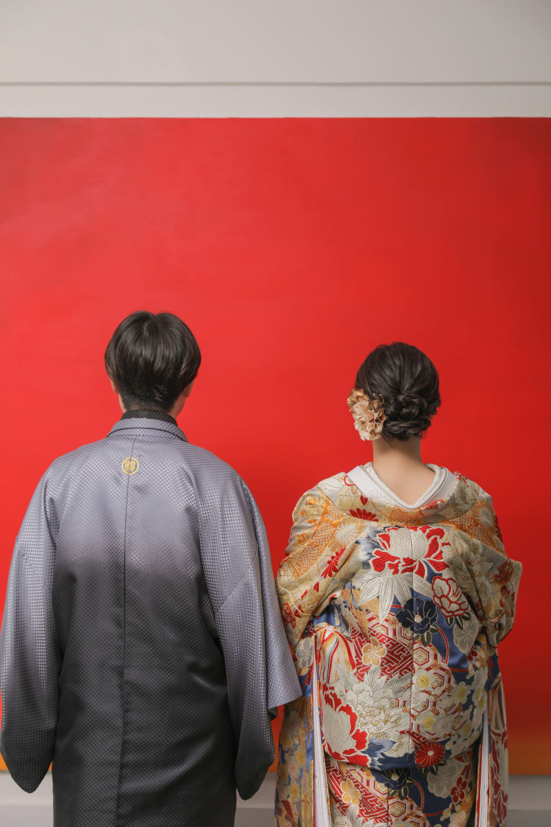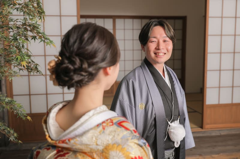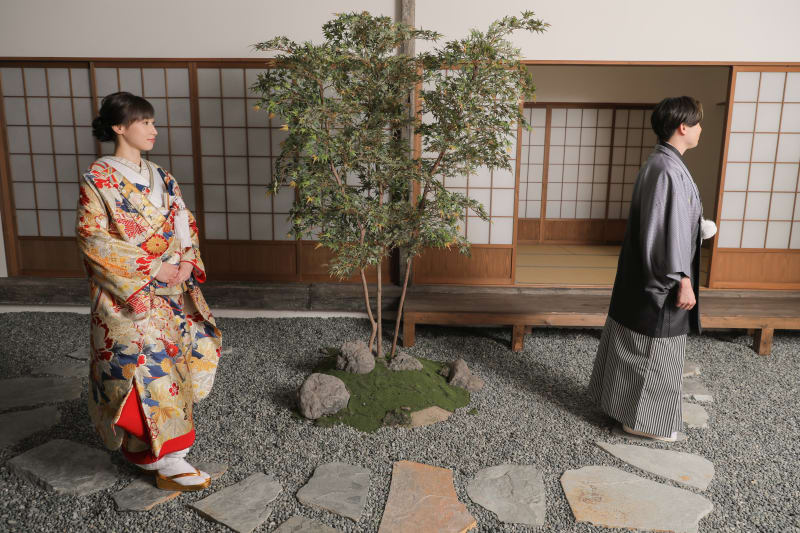 外を眺めるご新婦様に近づいていくご新郎様。 茶室内はあえて暗めにすることにより、さらにリアルな雰囲気を演出しています!