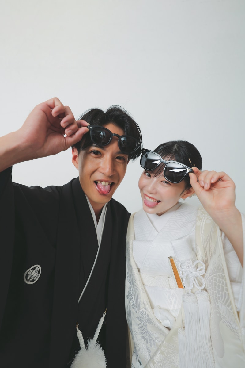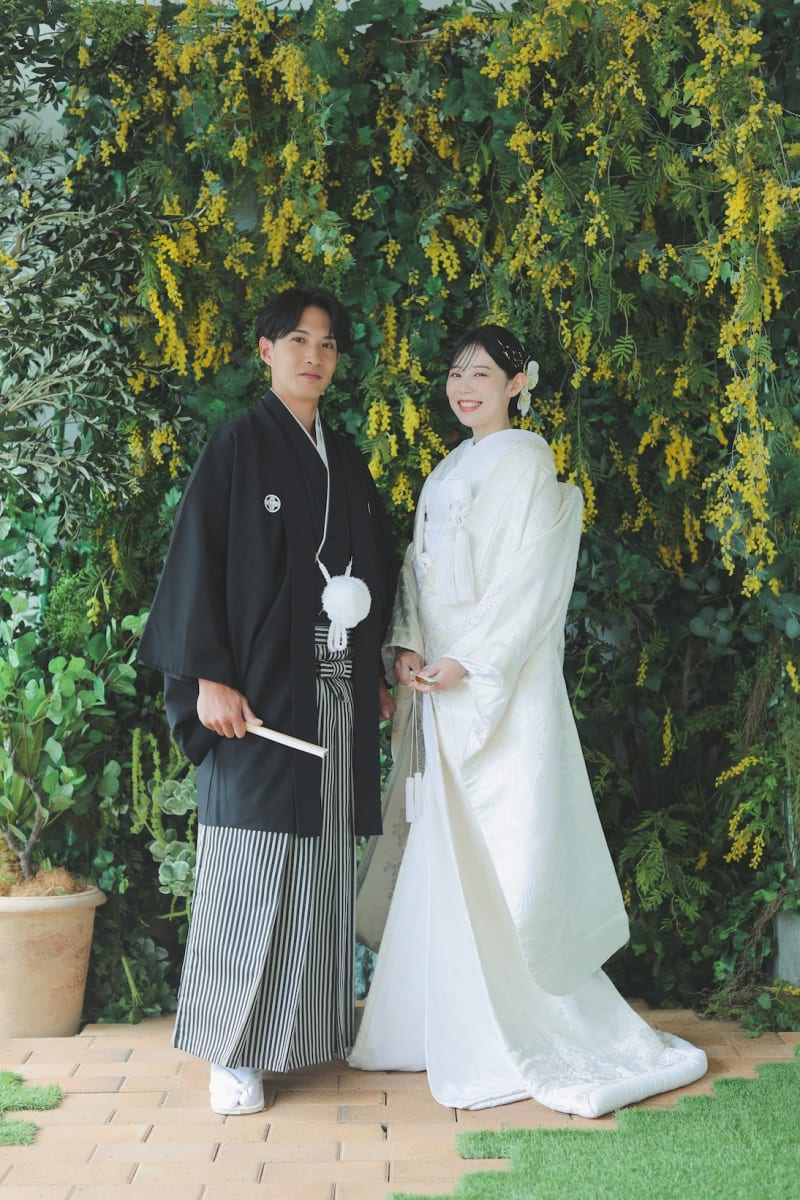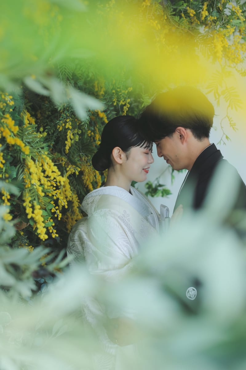 ミモザの背景でおふたりのフォーマルなショットから、、