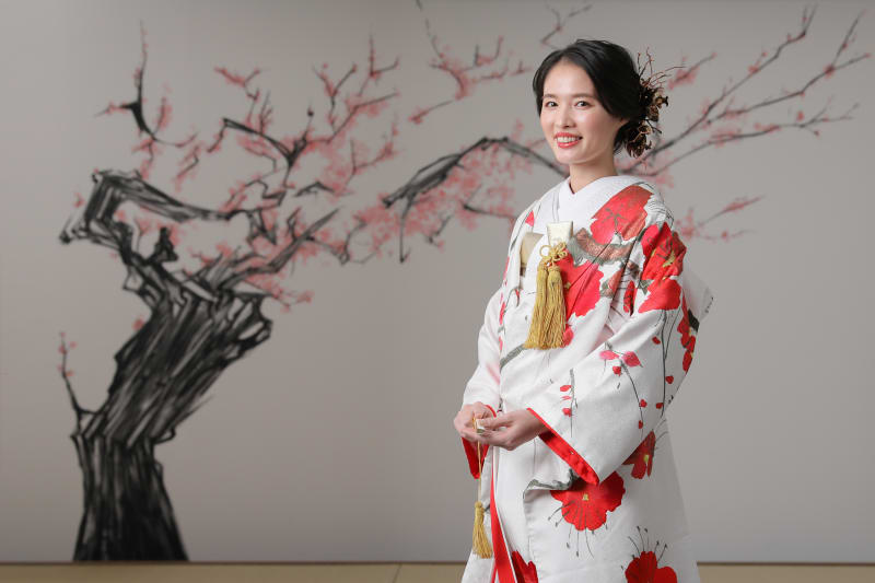 お二人でお選びいただいたお衣装は、白練春華梅図という 梅の花の柄がメインのお衣装でした。