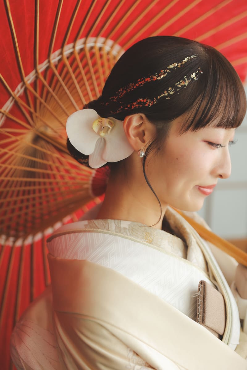 ヘアアクセサリーは金箔と胡蝶蘭を全体に散らすことにより、