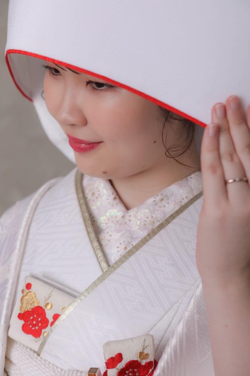 綿帽子をかぶることで、「花嫁を魔や災難から守る」意味と、「挙式が終わるまで新郎以外に顔を見せない」という意味が込められているそうです。