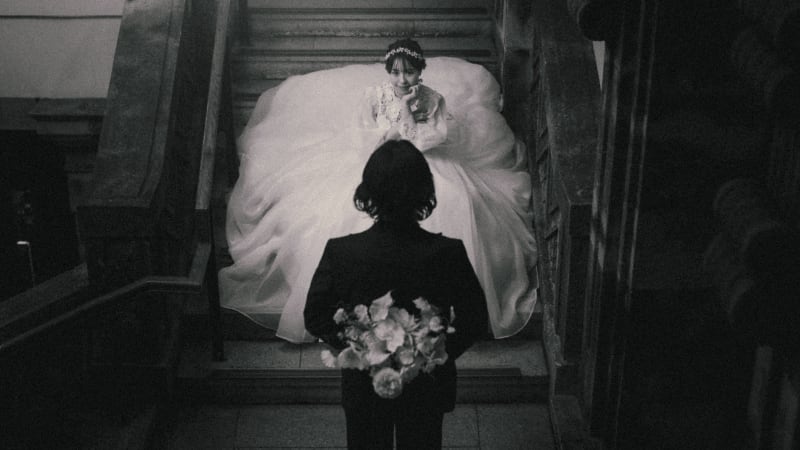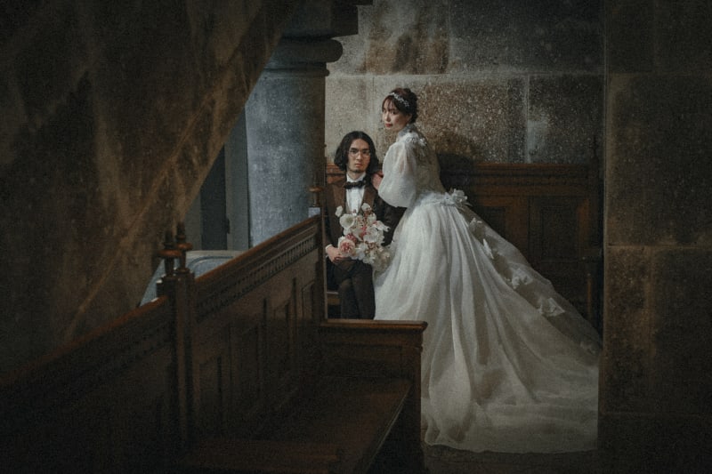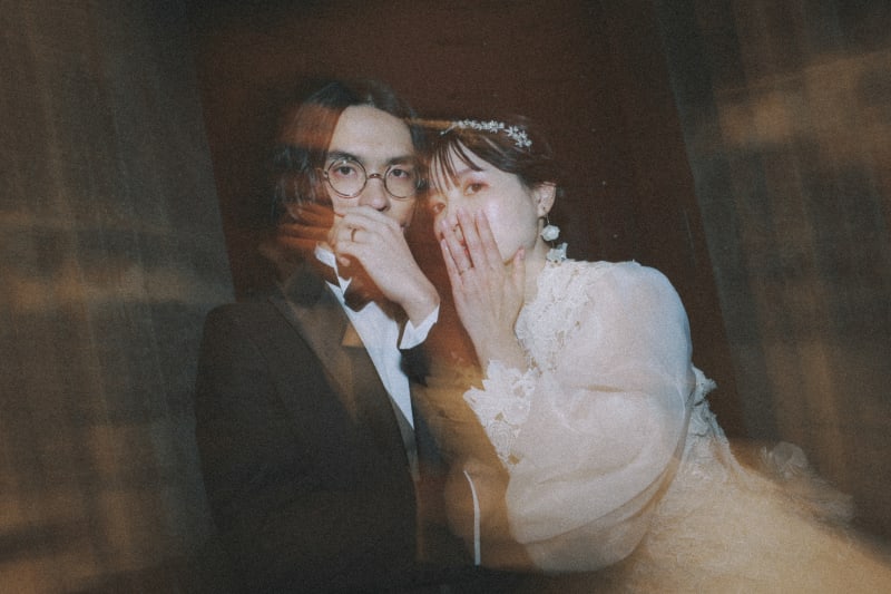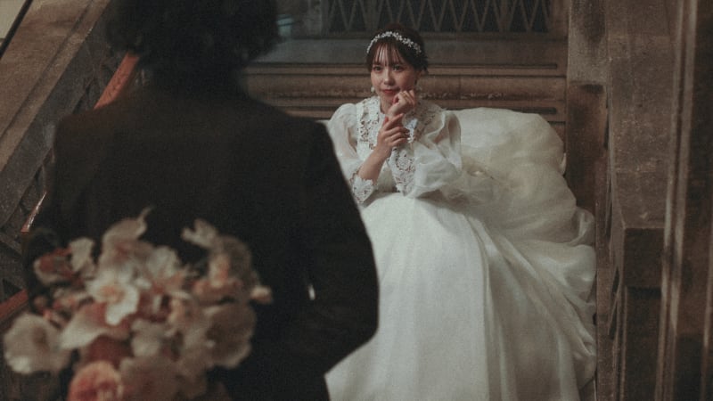 こちらは見ての通り、ブーケを新郎様が渡しにいくシーンのイメージカットです。 レトロにフィルム写真のようなレタッチをしてみました!