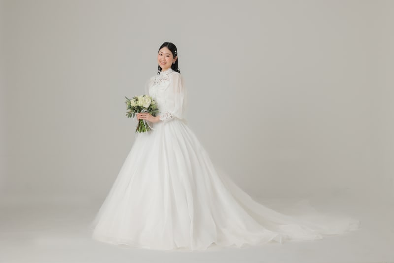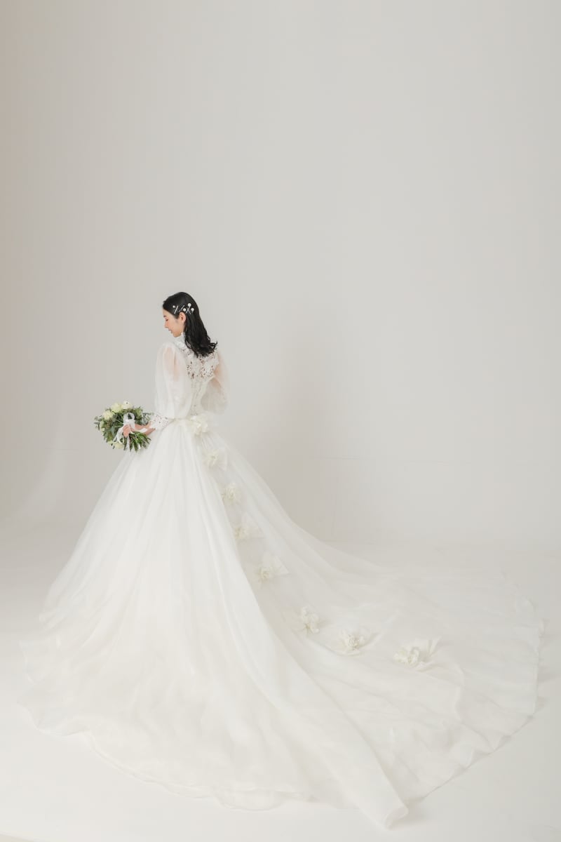 大柄で立体感のあるレースに、パフスリーブのデザインがプリンセスを彷彿とさせるYumikatsuraのドレス。