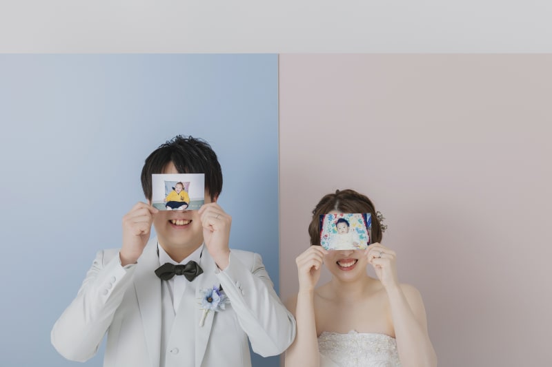 ピンクとブルーの背景で可愛い組み合わせ♪ お二人の幼少期の写真も一緒に!