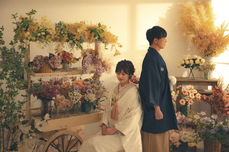 まるでお花屋さんのような背景で撮影できます。 和装でかっちりとした印象ですが、華やかな印象になります!