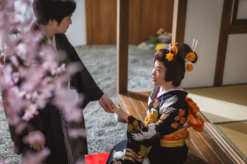 縁側に座る新婦様に手を取る新郎様の姿がとても素敵です!