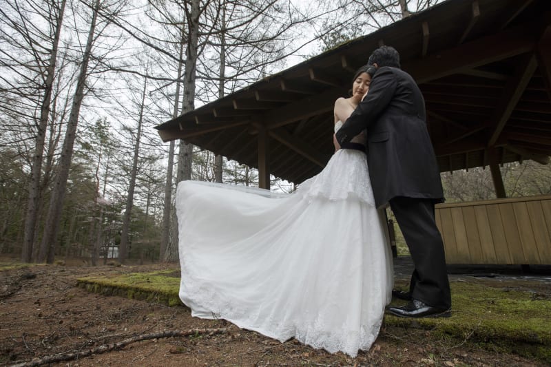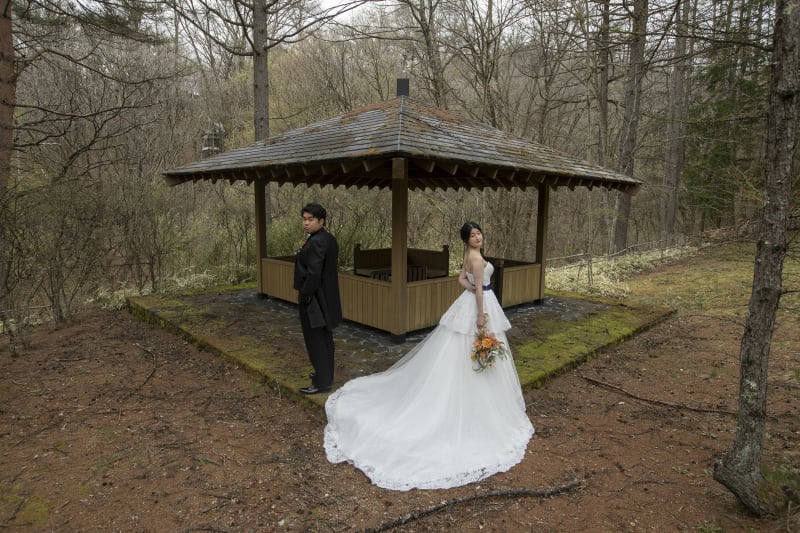 東屋の前でお互い背を向け、かっこいい写真に! ブーケも軽井沢の自然にピッタリですね