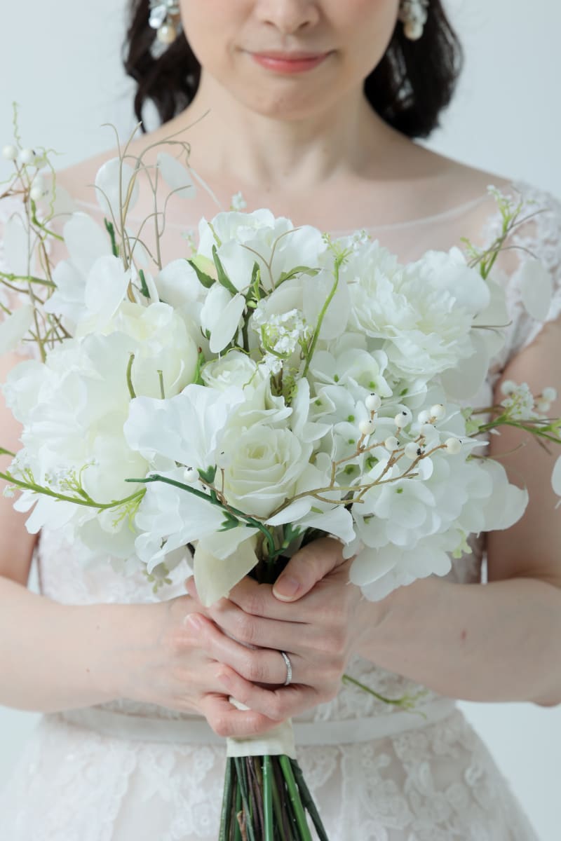 輝く指輪のお手元とお衣装にあったブーケとご一緒に^^