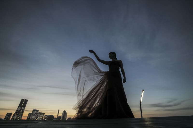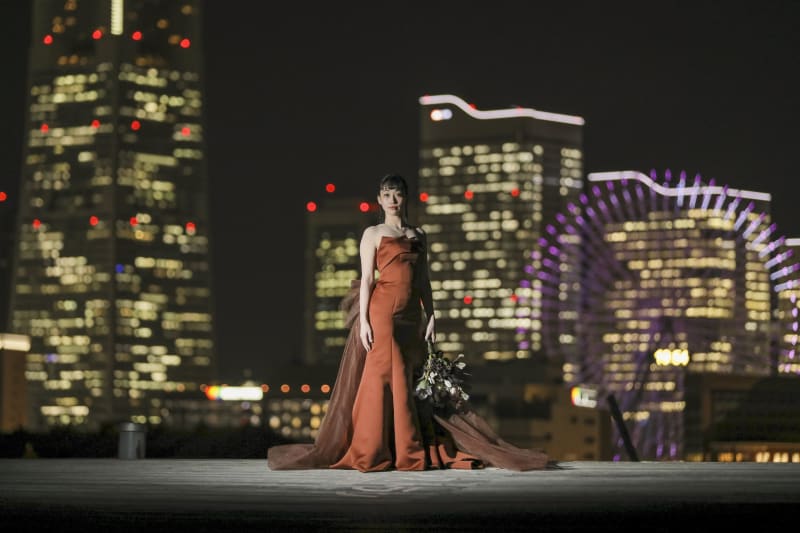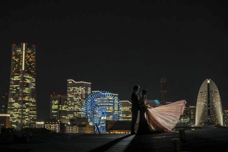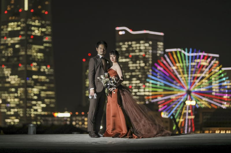 みなとみらいが一望できる背景でシルエット。こちらもカラードレスが映えます