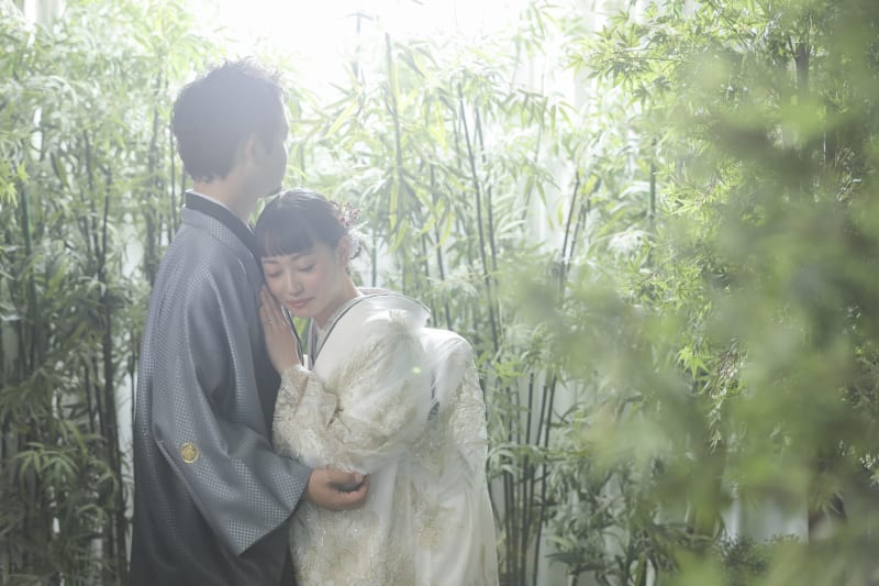 光あふれる竹林で新婦様が笑顔で新郎様の胸に寄り添います。