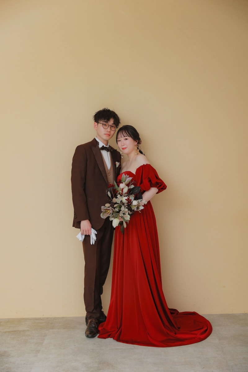 ベージュの壁の前でお二人の表情に注目!!