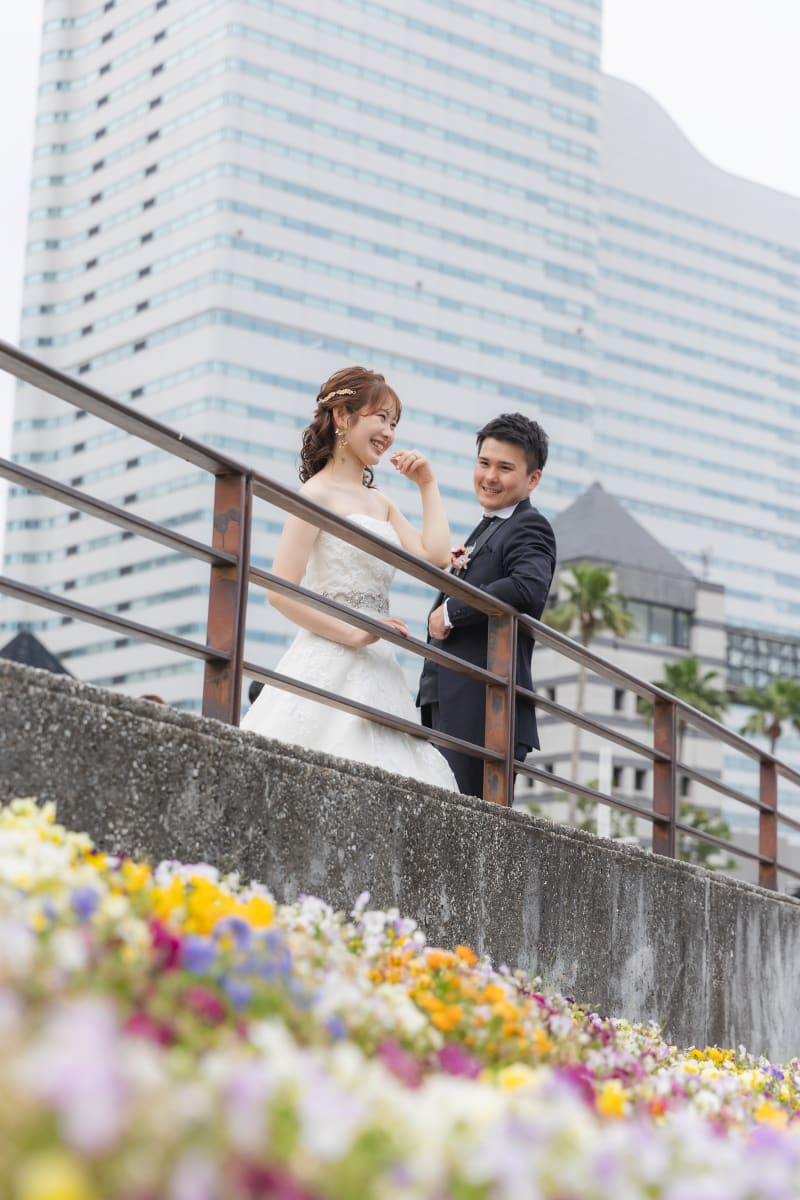 優しく新郎様が見つめる先には綺麗な新婦様が!下に咲く小さなお花も可愛いですね