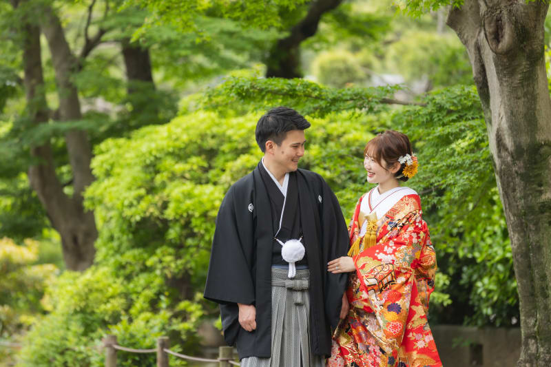 緑に囲まれながら赤いお着物がとても映えますね!新婦様の優しい表情が素敵です。