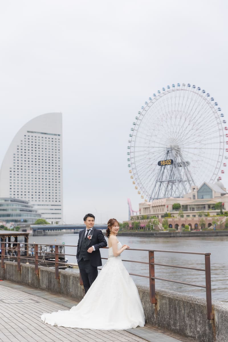 ランドマークタワーの近くに広場があり、大きな観覧車やみなとみらいの街並みが見えます!