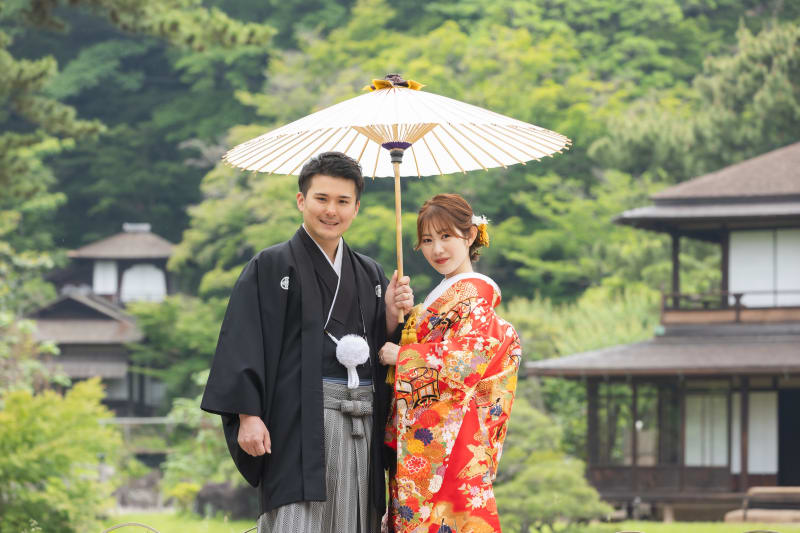 三溪園の撮影スタートです!お二人のお着物がとてもお似合いですね!