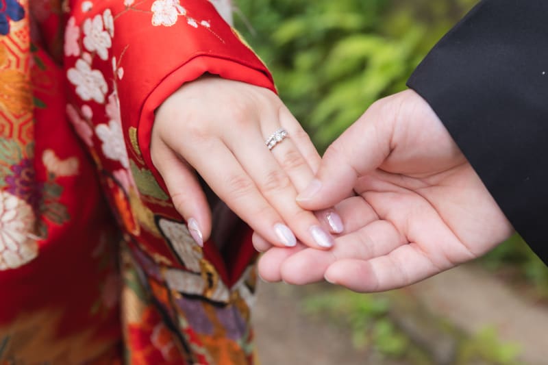 お二人が手を取り合っている素敵なカットです。指輪も輝いていて綺麗ですね!