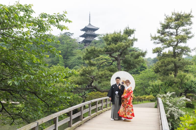 三溪園は風情ある日本庭園がある場所です。そんな中和装はすごく合います!相合傘をするのも可愛いですね!