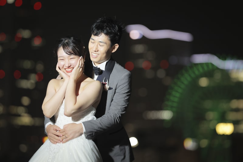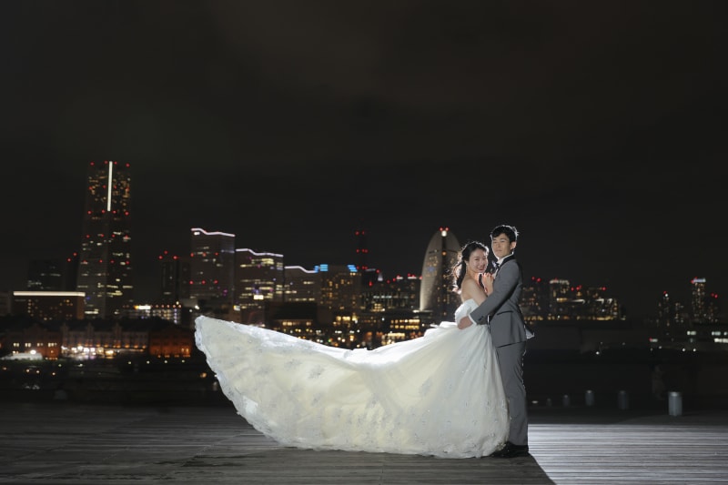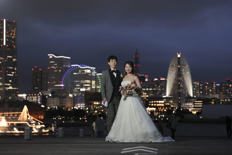 これこそみなとみらいの夜景!という感じの写真でドレスとタキシード姿のお二人が素敵です!