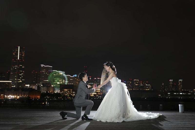 夜景をバックにプロポーズをする新郎様とそれを笑顔で受け取る新婦様がドラマチックで素敵です!