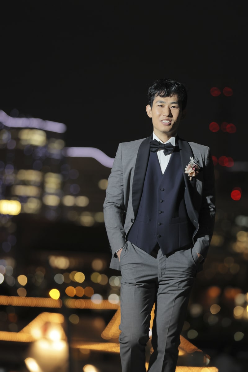 新郎様のソロカット。夜景にタキシードの組み合わせがかっこいいです!