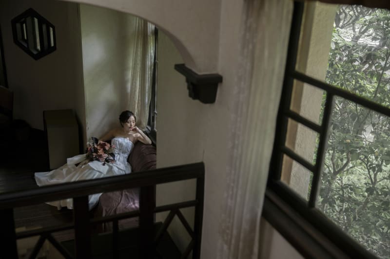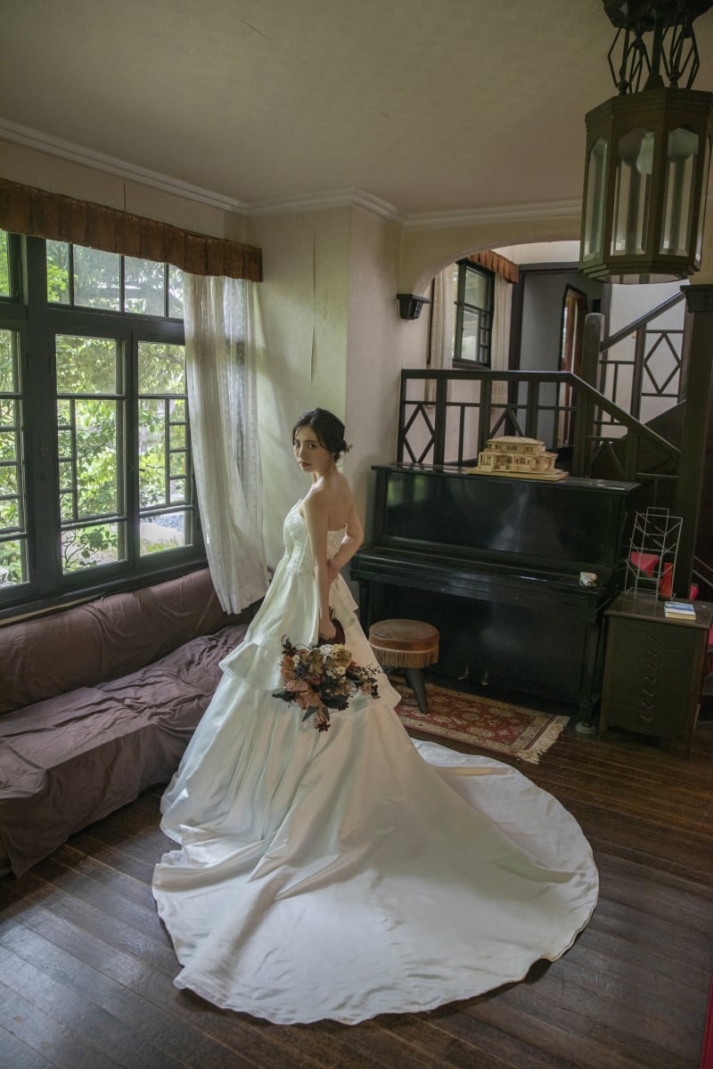 スレンダーな新婦様のバックショット。窓から差し込む光が美しい。