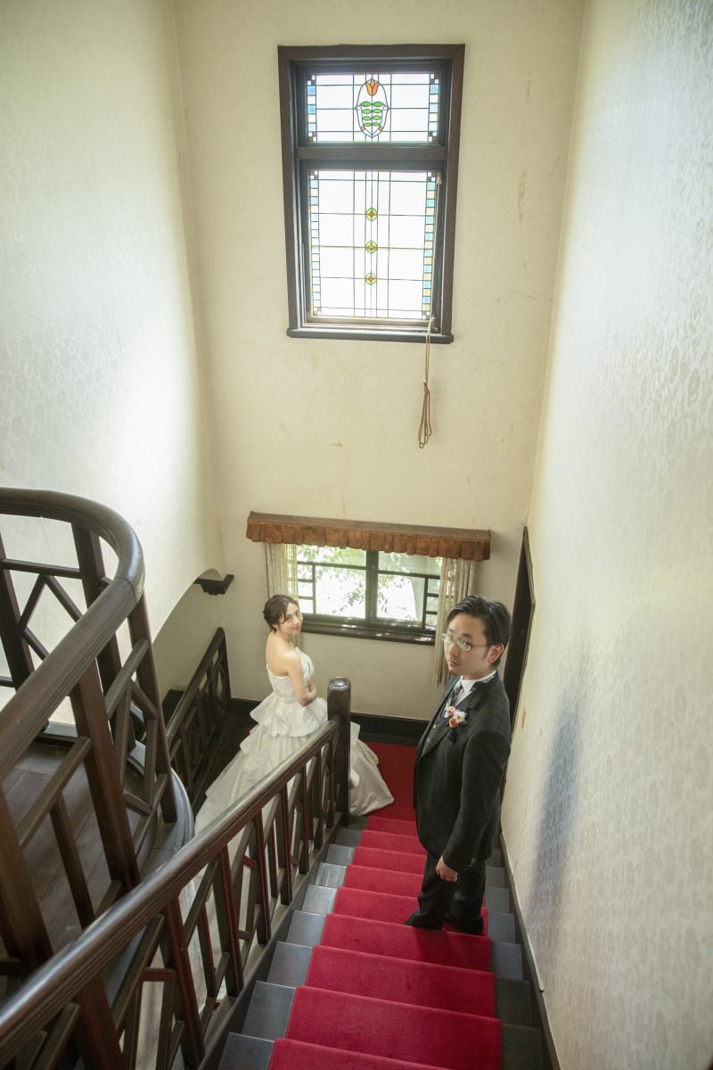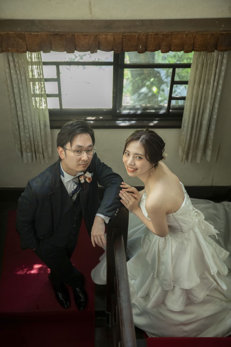 踊り場の手すりに寄りかかって可愛いツーショット。二人にはステンドグラスから柔らかな光が降り注いでいます