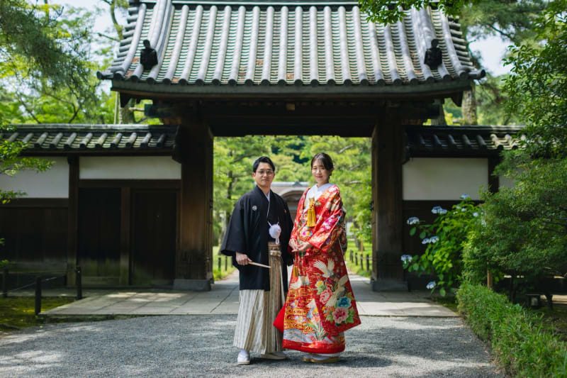 まずは御門の前での撮影!ここではお二人のフォーマルな立ち姿を撮影することが多いです!