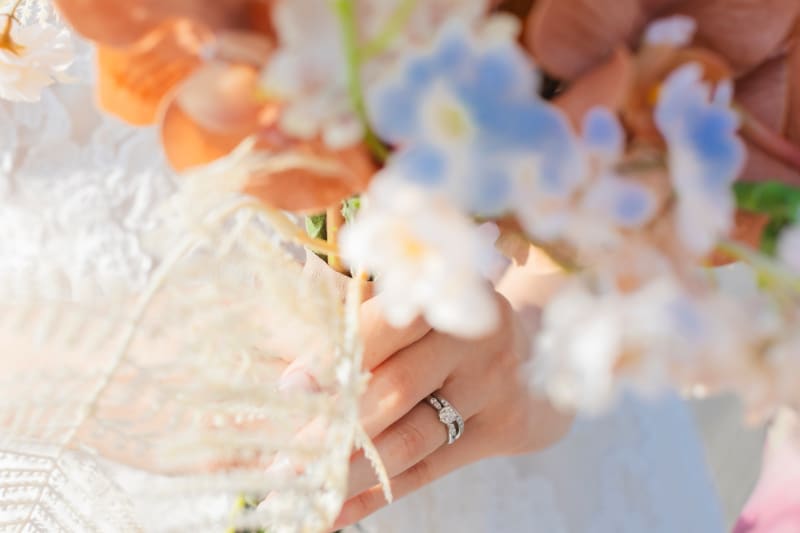 お花の中に紛れる指輪。色味も素敵でおしゃれなカットになっています。