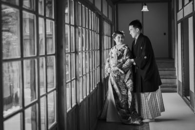 お茶室の中でのお写真は通常のスタジオでは撮れないような昔ながらの縁側や、ガラス戸なども