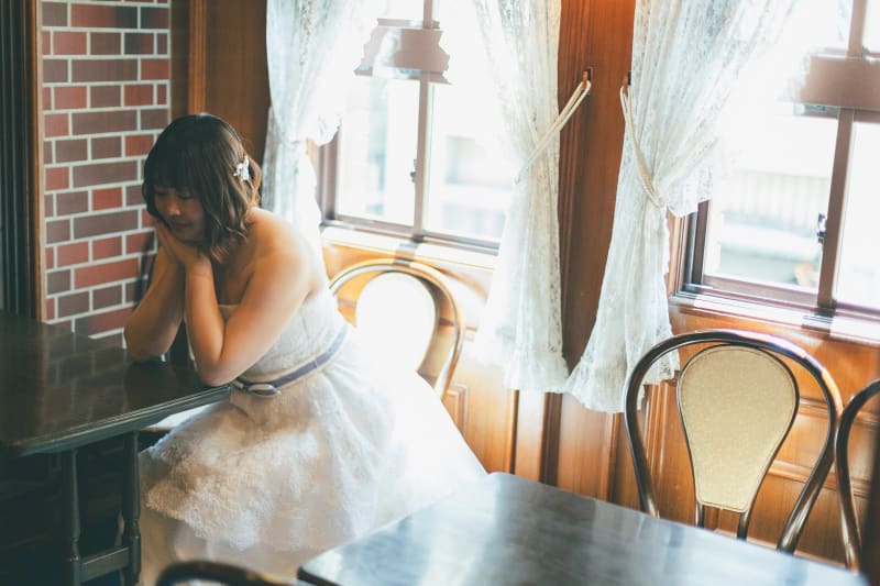 新婦様がメニューを悩んでいるようなお写真です! ドレスとお店も合いますね