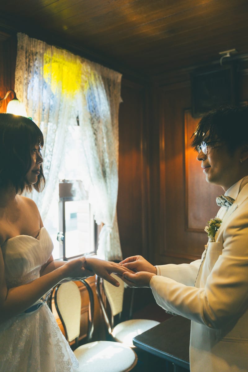 新郎様が新婦様の指に指輪をつけてくださいました! 見つめあっているお二人の横顔が素敵です!