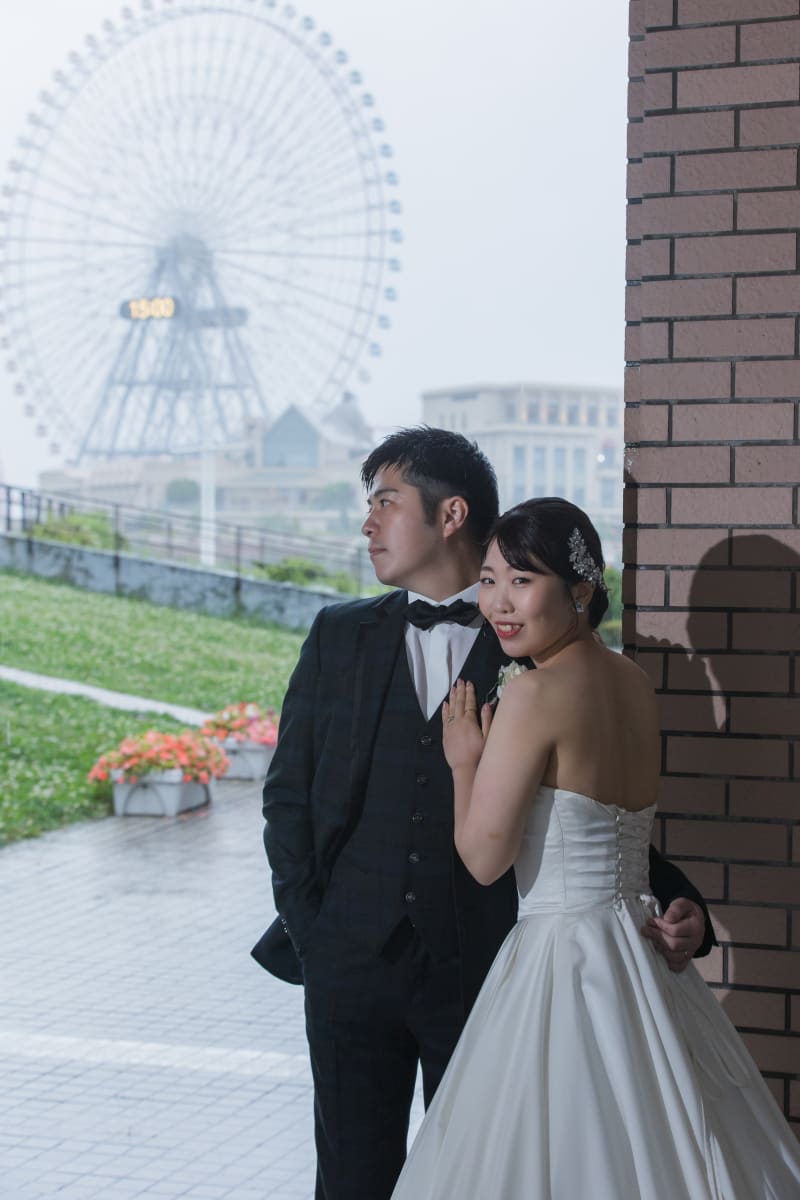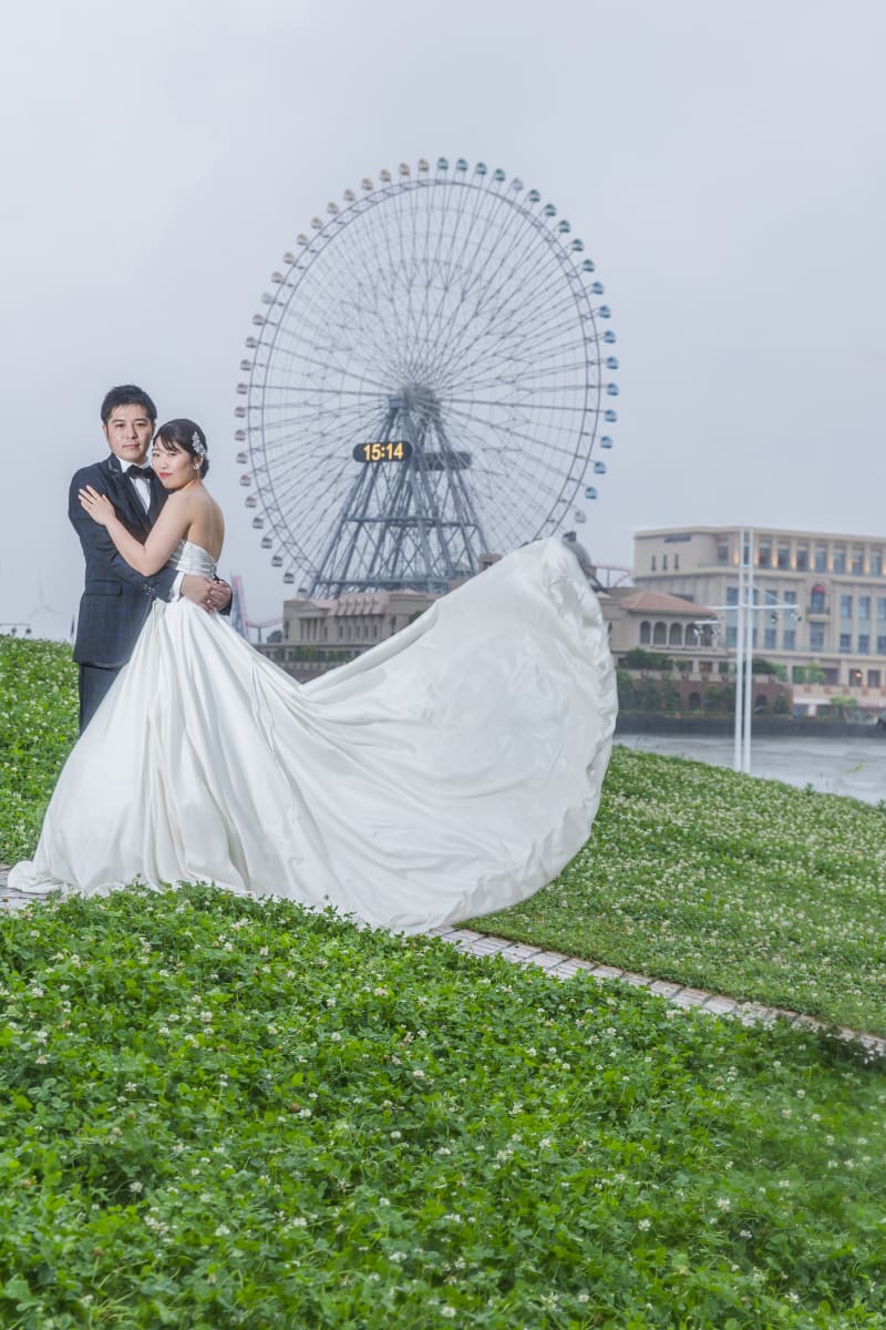 洋装に着替えてメモリアルパークに来ました! 観覧車が大きく見えて素敵です!