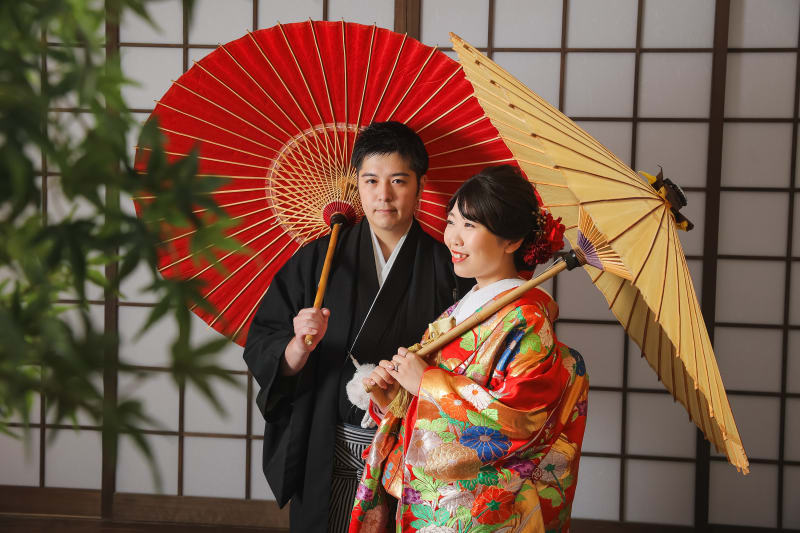 白と赤の和傘を持ってもらいました! 和装にとても合いますね