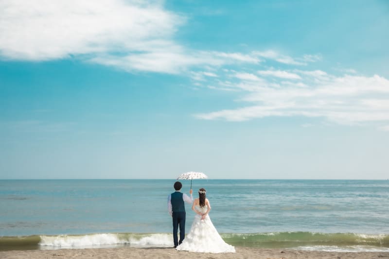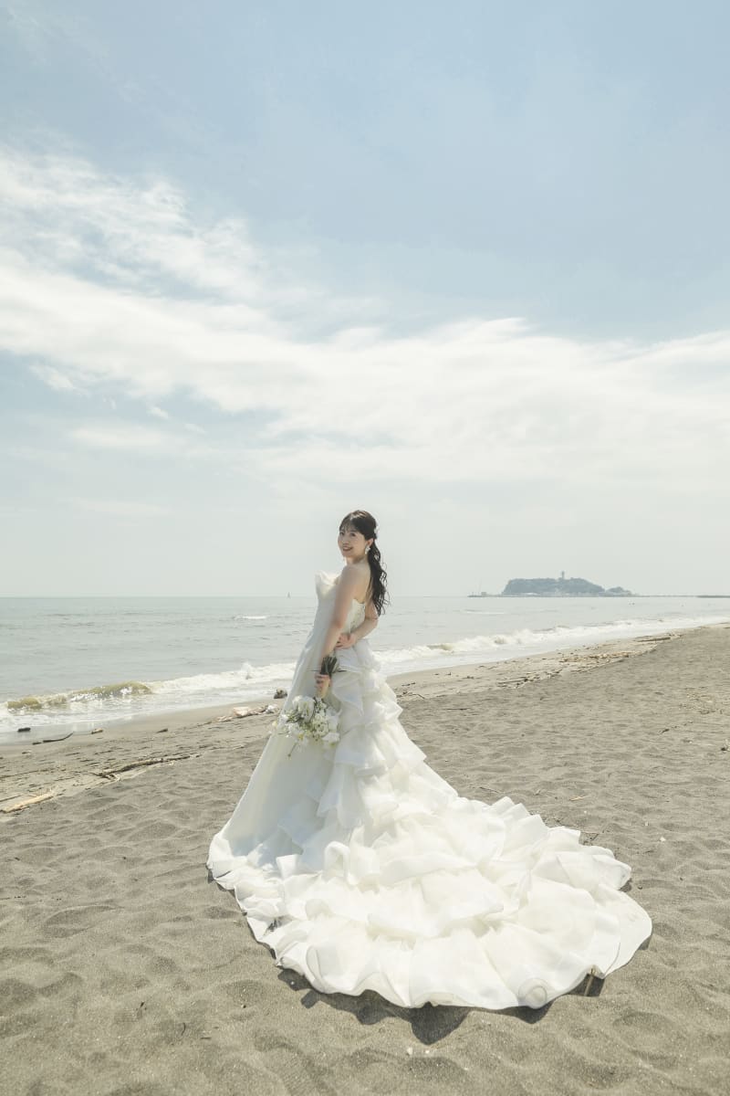 トレーンが映えるドレスだったので、青空と海を背景にバックショット!