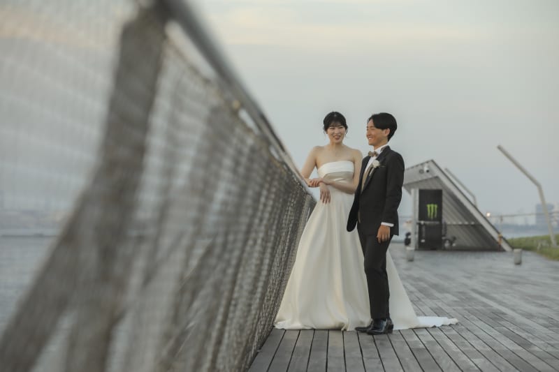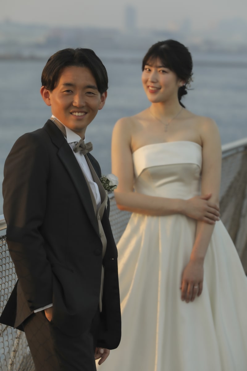 日が沈んで夜景スタートです!長いベールを使って幻想的な一枚に!靡いている感じがすごく素敵です!