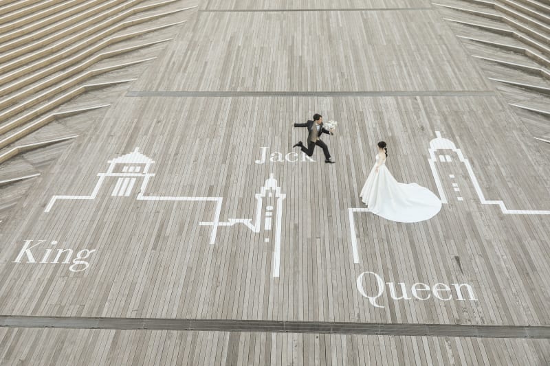 大桟橋といえば海、みなとみらいの景色ですが実は大桟橋にこのような絵があります! 大ジャンプした新郎様を待っている新婦様の可愛い写真が撮れます!