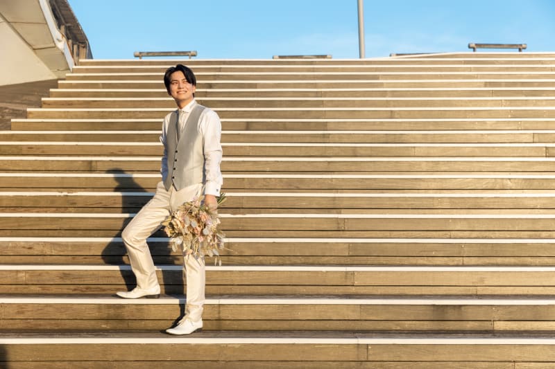 夕日に照らされる新郎様の爽やかな笑顔がとっても素敵です!