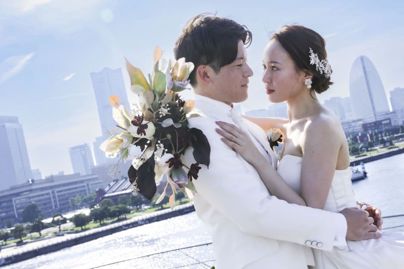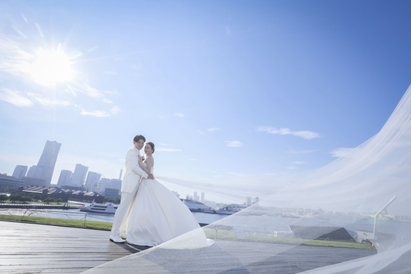 【横浜で記念日】汽笛が二人のスタートを祝う横浜のロケーションで美しい一枚を