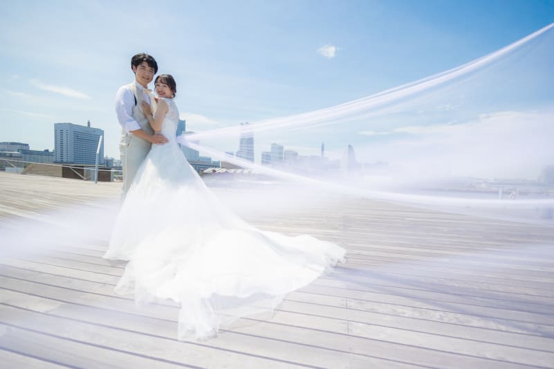 ベールを靡かせて素敵なお写真です! 新郎様にピッタリくっつく新婦様かわいいですね