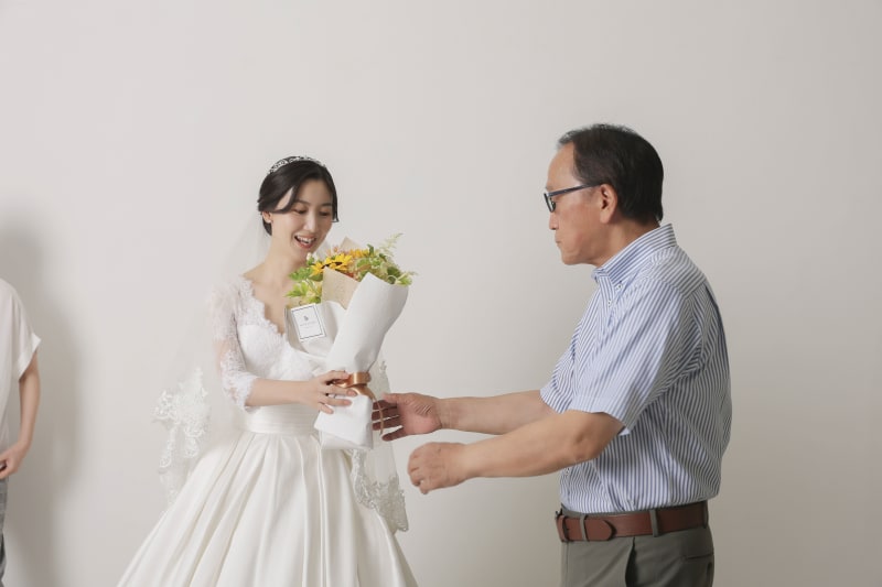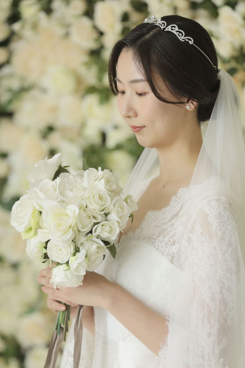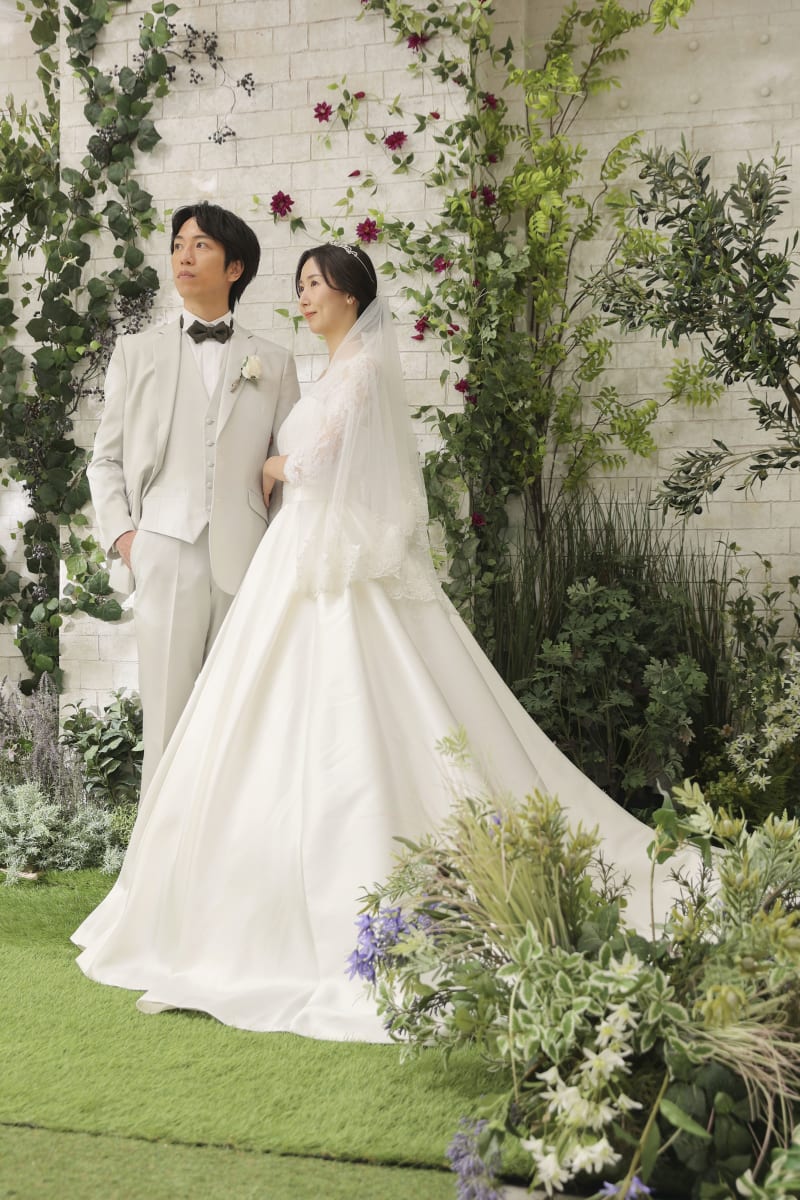フォーマルショットから撮影スタート 無地の背景に、お二人が映えますね